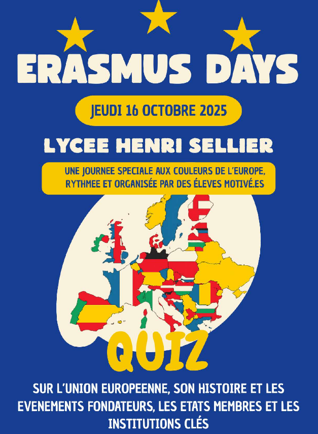 Erasmus Days animés par les T AGORA le jeudi 16 octobre ! Auteur/autrice de la publication :Webmaster Publication publiée :14 octobre 2025 Post category:Actualité et vie lycéenne Les Erasmus Days auront lieu le jeudi 16 octobre après-midi.Des quiz sur l’Union Européenne seront proposés et animés par les élèves de TAGORA. Si vous souhaitez y participer avec votre classe, merci de vous inscrire via le formulaire ci-dessous : https://forms.gle/EjRjB7ysu4UsZeUV6 Les places sont limitées et les inscriptions se terminent demain midi. Les professeurs des classes retenues seront informées via pronote. Mmes CARLIER et RAZANIERAEI Vous devriez également aimer Intervention d’un cadre de l’IFSI auprès des TSTS2 8 novembre 2021 Début des travaux de réhabilitation de la « Ferme école » au Sénégal dans la région de Thiès 22 mai 2024 Deux élèves de la classe média participent au jury académique MEDIATIKS ! 2 avril 2025