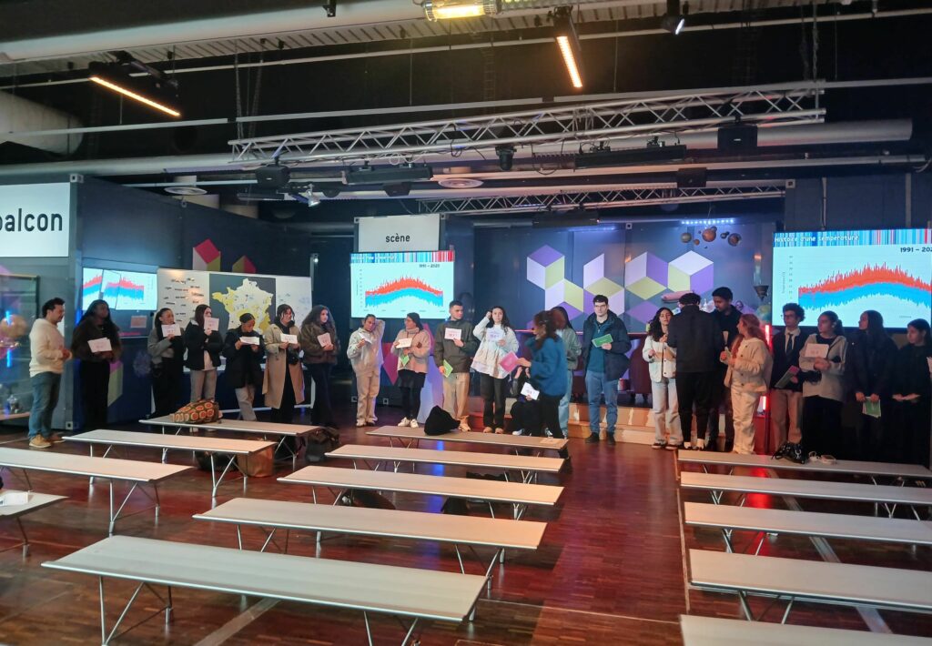 - La visite de l’exposition « Urgence climatique », suivie d’un atelier intitulé « Chasse au climat », animée par une médiatrice. Les élèves y ont partagé leur vision du climat en France, puis ont participé, aux côtés de leurs enseignants, à la réalisation d’une frise chronologique géante retraçant l’évolution des températures en France sur les 50 dernières années à partir de données statistiques. L’atelier s’est conclu par un quiz interactif.