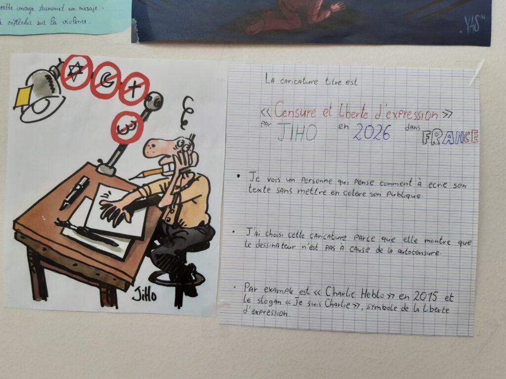 Les pouvoirs des caricatures Auteur/autrice de la publication :Webmaster Publication publiée :25 mars 2026 Post category:Actualité et vie lycéenne / Actualités 2025-2026 / Mars 2026 La classe de 2FLE organise une exposition sur les caricatures dans le cadre de la semaine de la presse et des médias.Les élèves ont choisi des dessins qui traitent de l’actualité sur le site cartooningforpeace.org et vous livrent leur analyse.Vous pouvez visiter librement l’exposition qui se trouve au 2e étage du bâtiment A, à côté de la salle A215. Projet encadré par M. Briffon. Vous devriez également aimer Les Ambassadeurs Santé – Égalité du lycée se mobilisent contre les violences faites aux femmes 18 mars 2025 Parcours de vie – Exposition virtuelle des 2nde7 (2022-2023) 12 juin 2023 20 décembre 2018 – Escape Game « Stop pauvreté » en STSS / partenariat avec l’IUT Carrières sociales 21 décembre 2019