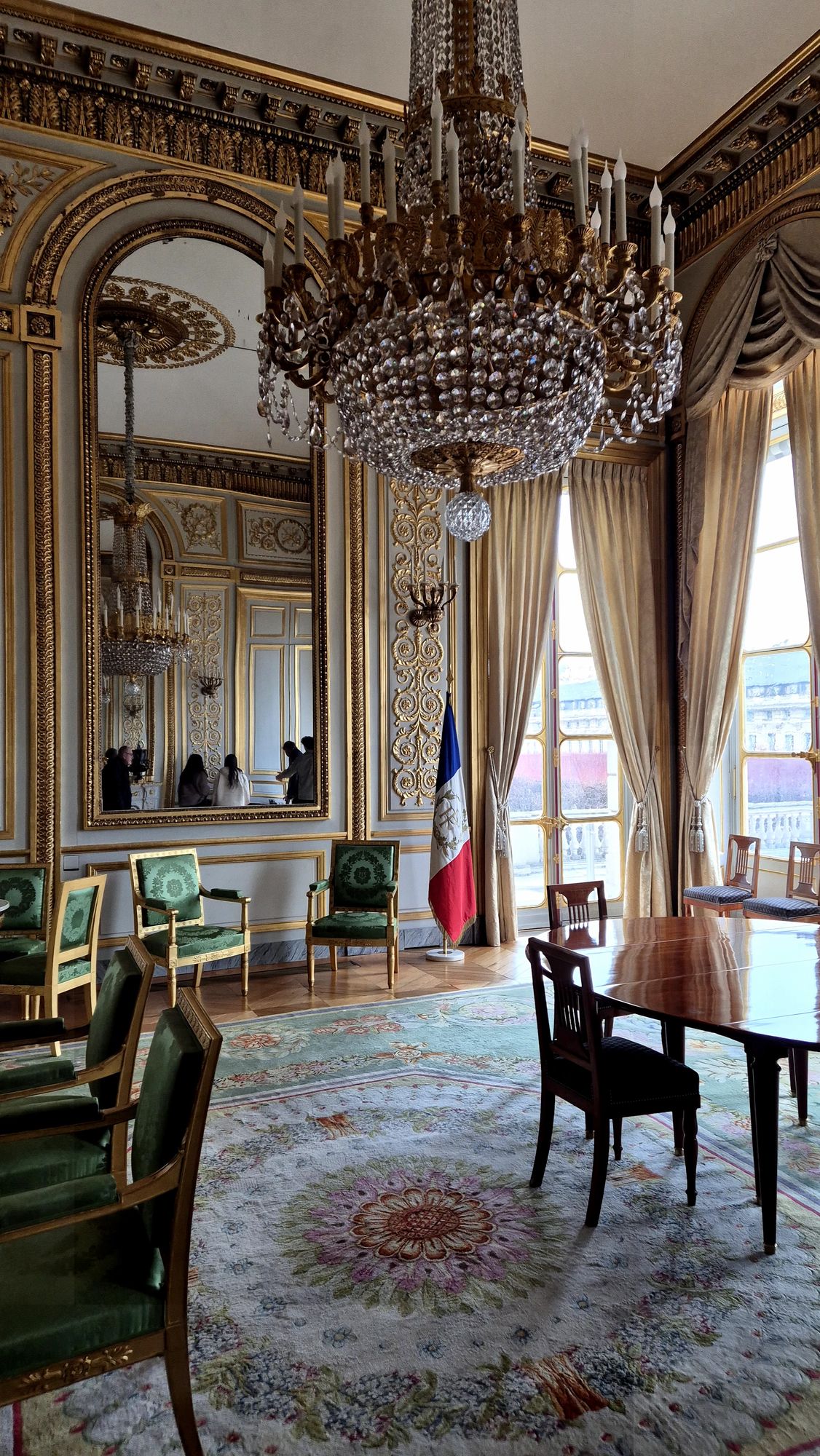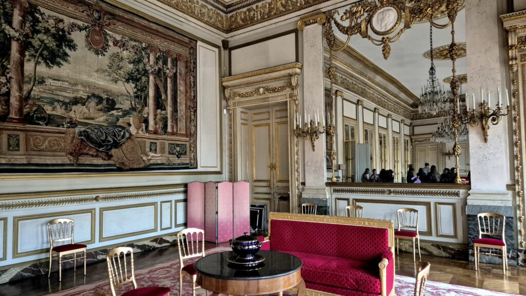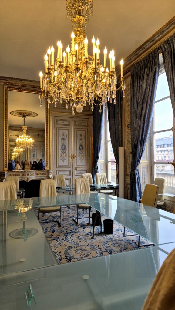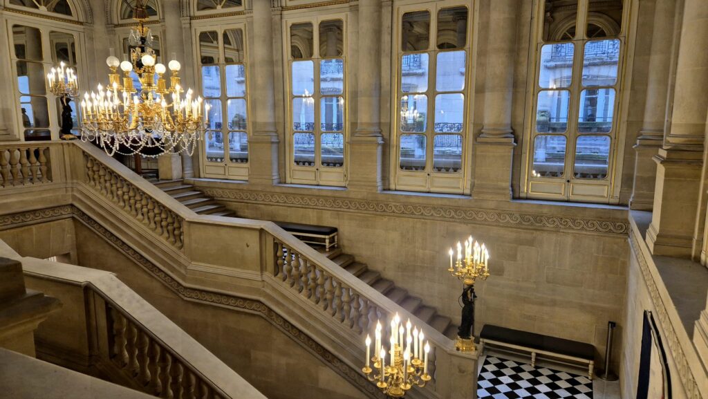 La visite s’est poursuivie avec Mme Gourrier, chargée de mission au service des relations extérieures et de la communication, qui a guidé le groupe à travers les lieux emblématiques du Conseil : le Grand escalier, le grand salon, la salle des délibérés et la pièce qui faisait anciennement office de bureau du Président du CC.
